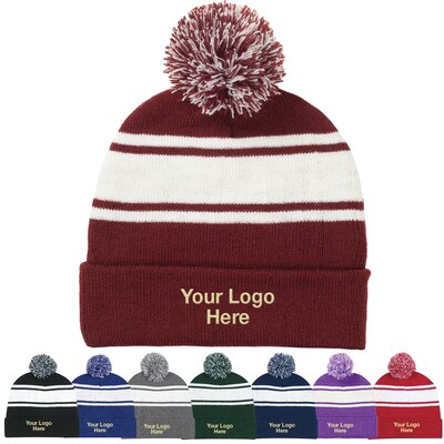 Custom Embroidered Two Tone Knit Pom Beanie With Cuff