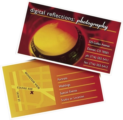- 3.5" x 2" business cards with horizontal or vertical orientation