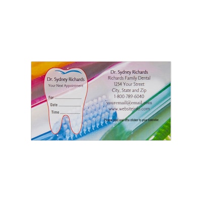 This full color appointment card includes a removable tooth sticker on the left side of the card to write appointment date and time information.