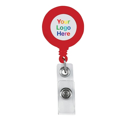 - Round badge holder. Has a laminated full color imprinted label.