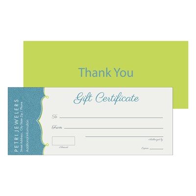 - 8.5" x 3.5" gift certificates with a horizontal orientation.