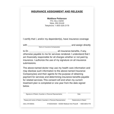 Form specifies patient insurance coverage and authorizes assignment of payment to your practice.