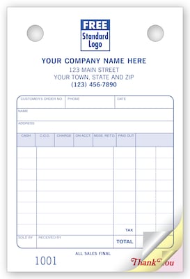 - Preprinted areas simplify write-ups of customer information, salesperson, description of items, payment method & more
