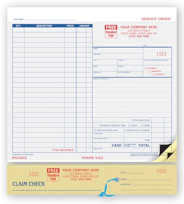 Custom Service Orders, Carbon, Claim Check, Large Format, 2 Parts, 1 Color Printing, 8 1/2" x 9 1/4",500/Pack