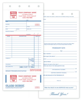 Custom Service Orders - with Claim Check and Carbons 2 Parts, 1 Color Printing, 4 1/4" x 7 1/4",500/Pack