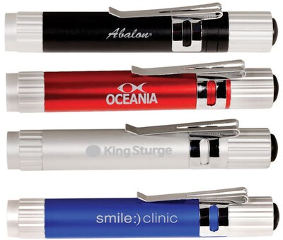 - Easy-to-use with rubber push button on/off switch on the end of the barrel. Pocket sized with a clip attachment for easy carrying