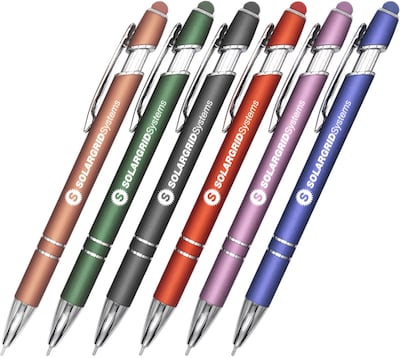 - Double decorative bands and screen printed imprint. Touchscreen stylus on the end of the pen