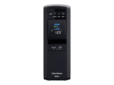 A mini-tower UPS with line interactive topology, the CyberPower PFC Sinewave CP1500PFCLCD provides battery backup (using sine wave output) and surge protection for desktop computers, workstations, networking devices, and home entertainment systems requiring active PFC power source compatibility. The CP1500PFCLCD features an advanced multifunction control panel with a color LCD to quickly confirm status and alerts at-a-glance. The screen tilts for easy viewing when the UPS is placed in a low position suchas under a desk. Two USB charge ports (one Type-A and one Type-C) power portable devices such as mobile phones and tablets, even during a utility power failure. The CP1500PFCLCD uses Automatic Voltage Regulation (AVR) to correct minor power fluctuations without switching to battery power, which extends battery life. AVR is essential in areas where power fluctuations occur frequently.