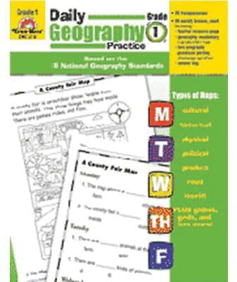 Daily geography practice resource book for grade 1 includes 36 map lessons to introduce basic geography skills and more than 60 geography terms. Evan-Moor® "Daily Geography Practice" Resource book is ideal for grade 1 and includes compass roses, map grids, street maps, state maps or tourist maps of the U.S. Resource book with 196 pages is ideal to approach geography instruction.
