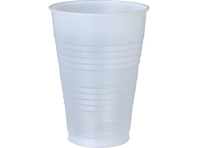 Provide drink containers to employees, customers and others with these cold cups. The sturdy plastic construction protects against leaks, while the double sidewall ridges offer increased durability, allowing for repeated use. These Conex Galaxy translucent plastic cold cups have a 16-ounce capacity and come with 1,000 to a case, making it easy to restock your supply.