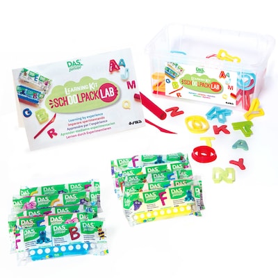 A fun new way to teach the alphabet! DAS Junior Air Hardening modelling clay in a ready to use complete kit for the classroom. The Letters Schoolpack Lab contains the tools to teach the alphabet: 1 educational poster, 10 blocks DAS Junior 100g in red and yellow, 26 letter molds, 8 rolling pins, 8 cutting spatulas and 2 resealable bags for clay storage. Mineral based clay is gluten free and AP Certified.