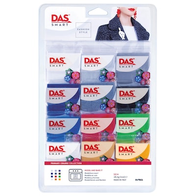Easy to manipulate, with a compact and versatile structure, DAS Smart is the PVC-based oven-hardening clay that does not stain your hands. It is ideal for making murrine, creating jewels and small artifacts. Bake in a 130° oven for up to 30 minutes, but objects can be cooked several times to add new details. Includes 1 oz. each of White, Warm Yellow, Carmine Red, Spring Green, Night Blue, Cool Grey, Black, Blue Glitter, Metallic Gold, Metallic Silver, and Phosphorescent.
