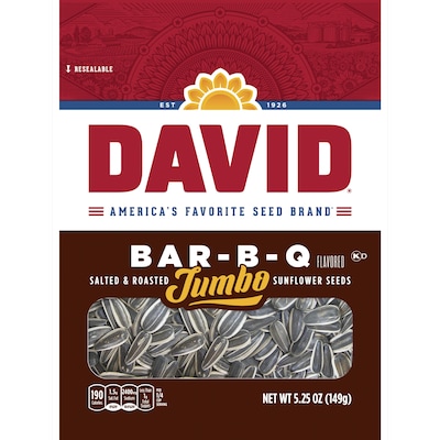 Try roasted sunflower seeds in a tangy BBQ seasoning—the perfect complement to a great barbecue! Hunger won't wait for crunch time. Grab a bag of DAVID Bar B Q Jumbo Sunflower Seeds to tide you over through the home stretch. DAVID Seeds offer a delicious, and crunchy bite on the go. Snack on these satisfyingly crunchy and salty sunflower seeds whenever hunger strikes. Each 5.25 oz Pack contains about 2 servings, with 190 calories, 7 grams of protein, and 2 grams of fiber, as well as 10% of your daily allowance of Vitamin E, 25% of phosphorus, and 25% of magnesium per serving. Since 1926, DAVID Seeds provides a quality difference that you can taste with select top quality seeds, roasted and seasoned to perfection. This Pack contains one 5.25 oz bags of DAVID Bar B Q Jumbo Sunflower Seeds, great for group and solo snacking.