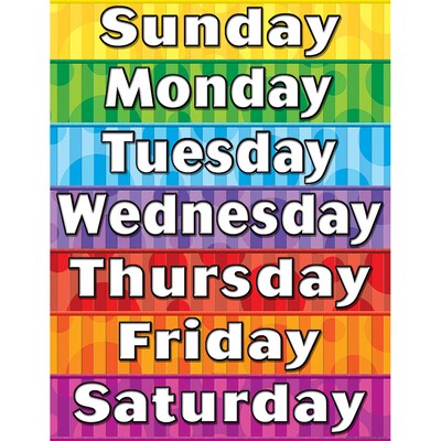 Teacher Created Resources® Days of the week chart for grades 1 - 5 in stylish/innovative design features convenient learning tool that decorate as they educate. Assorted color chart measuring 22" x 17" includes related lessons and activities.