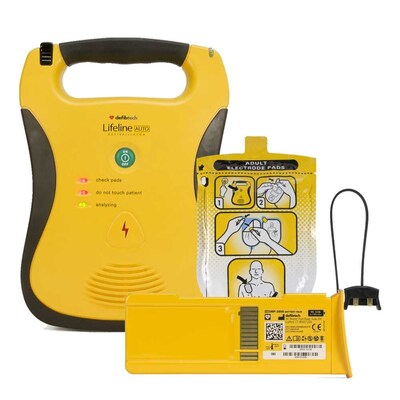 Help save lives with this fully automatic defibrillator. Automation makes for simple one-button operation and analyzes the patient's heart rhythm and intervenes accordingly. Featuring clear voice prompts, this defibrillator offers concise instructions while keeping you calm to reduce the risk of mistakes and has LED indicators to reinforce the audio instructions. With rugged construction this AED is durable, ideal for harsh environments, while the lightweight design improves portability for quick response to emergencies. The spacious rubber handle provides a comfortable and secure grip, and the bright yellow color is easily visible for rapid deployment. This Defibtech Lifeline AUTO defibrillator uses biphasic technology to administer the right levels of shock.