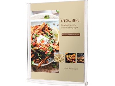 Perfectly designed and sized for all your restaurant, food-service, and hospitality needs, this Deflecto freestanding sign and menu holder showcases your menus, daily specials, or other messages through the clear front panels, offering full visibility. Signs can be viewed from both sides to maximize your display capabilities.