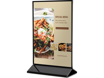 Perfectly designed and sized for all your restaurant, food-service, and hospitality needs, this Deflecto freestanding sign and menu holder showcases your menus, daily specials, or other messages through the clear front panels, offering full visibility. Signs can be viewed from both sides to maximize your display capabilities.