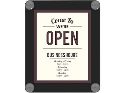 - Double-sided sign display easily mounts to glass, doors and walls with suction cups (included)
