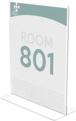 Stand-Up, doble-sided sign holder allows user to display a portrait (8.5" x 11") message. Ideal for retailers, restaurants, trade show settings, and more. Design is side-loading and self-standing.