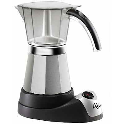 Delonghi Alicia moka espresso coffee maker features a durable clear container for easy brewing process and an automatic shut-off switch for saving energy.