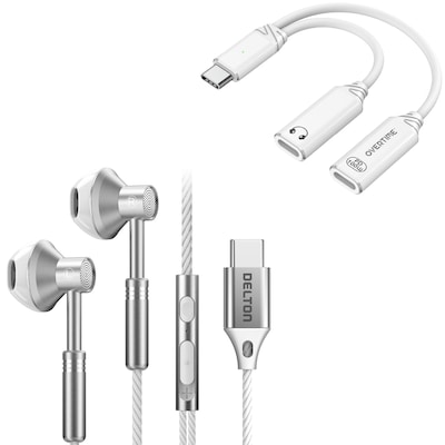 Enjoy power and sound in one bundle with a usb-c splitter and wired earbuds with microphone designed to work hand in hand. The usb-c splitter supports 100W fast charging while doubling as an audio splitter, so you can keep music, calls, or gaming going without losing power. Built for comfort, the usb-c wired headphones feature 14mm drivers, noise reduction, and in-line controls for effortless play, pause, and calls. Durable braided cables and a compact build make the wired ear buds reliable at home, in the office, or on the go. Together, this usb-c splitter (1 in 2 out) and wired headphones with mic form a complete set for clear sound and nonstop connection.