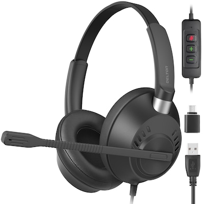 Immerse yourself in crystal clear communication and vibrant sound with the Delton 42Y USB headset. Featuring Environmental Noise Cancellation (ENC) that reduces background noise and ensures clear conversations, the headset also boasts a high-quality mic that projects your voice loud and clear, making this headset perfect for calls and virtual meetings. Enjoy high-fidelity stereo sound for rich and vibrant calls and music. The flexible and adjustable mic captures sound from all directions, optimizing voice pickup for seamless communication. Control your audio effortlessly with intuitive in-line controls for mic mute, volume adjustment, and call handling. With plush ear cushions and adjustable headband, this computer headset with mic provides maximum comfort for extended listening sessions. Compatible with a wide range of devices and operating systems, including computers, laptops, tablets and smartphones, the Delton 42Y wired headset offers versatility for both professional and personal use.