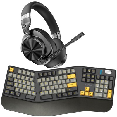 Tackle your day with the Delton Wireless Ergonomic Keyboard and ANC Headset Bundle, built for professionals, educators, and hybrid workers who demand comfort, clarity, and seamless connectivity. The split ergonomic wireless keyboard features a sculpted layout, mechanical switches, and tri-mode input including Bluetooth, USB-C, and 2.4G wireless for smooth device switching. The Hi-Fi headset delivers powerful over ear noise cancelling headphones performance with hybrid ANC, four tuned mics, and a detachable boom mic for crystal-clear calls. Enjoy up to 100 hours of battery life, fast USB-C charging, and all-day wearability with memory foam ear cushions and a padded headband. Designed for comfort and control, this bundle is the ultimate upgrade for your work headset with mic needs at home or in the office.