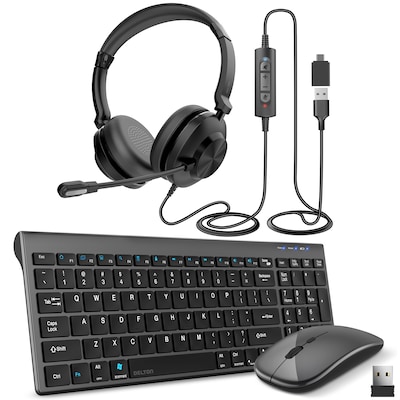 Delton N36 Wireless Keyboard Mouse and USB-A/USB-C Noise-Cancelling Computer Headset Bundle, Black (DKMN36KT1)