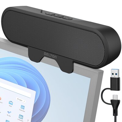 Elevate your workspace with the Delton P150 computer speaker, featuring dual USB Type-A and Type-C connectivity for seamless compatibility with modern devices. Delivering 10W peak power, this usb speaker boasts dual high-quality speakers and a passive radiator, producing rich, immersive audio for work, and entertainment. The sleek clip-on design with adjustable brackets on this computer sound bar accommodates various screen sizes, ensuring a stable, space-saving setup that enhances your desk's aesthetics. Say goodbye to clutter with a single USB cable managing both power and audio. With plug-and-use functionality, intuitive controls, and versatile compatibility with PCs, laptops, and monitors, this compact yet powerful pc speaker delivers effortless, high-quality sound for every occasion.