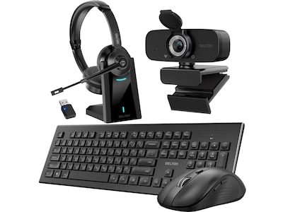The Delton Work Anywhere 35X kit is designed to get you up and running and ready for business. The 35X wireless four-in-one bundle includes a reliable 35X stereo wireless Bluetooth headset with a powerful battery and best-in-class noise-canceling chipset, a wireless full-size keyboard, a wireless six-button mouse, and a 1080p/30 fps USB webcam. Delton listened to your feedback and created a kit that's designed to get you working quickly. No software installations are needed, just plug and use. Each tool is adjustable for maximum comfort, has intuitive controls, and comes with a long-lasting battery: all the features you need to get the job done.