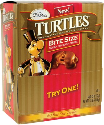 DeMet's Turtles Original bite size consists of a delicious combination of creamy caramel and crunchy pecans for a delightful bite. The Turtles Original bite size is perfect for single-serve snacking and is sold as 60 in a box.