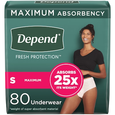 - Depend Fresh Protection Incontinence Underwear for Women, small (24–30" waist), 80 count; same trusted protection, improved; HSA/FSA-eligible in the U.S.—packaging may vary.