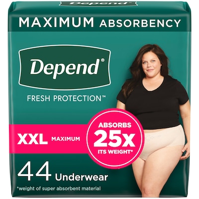- Depend Fresh Protection Incontinence Underwear for Women, extra-extra-large (55–64" waist), 44 count; same trusted protection, improved; HSA/FSA-eligible in the U.S.—packaging may vary.