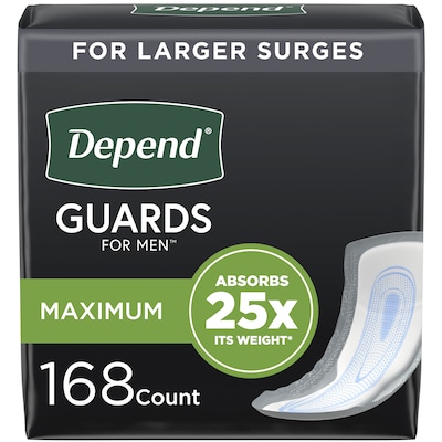 - Depend Incontinence Guards for Men, 168 count; same trusted protection; HSA/FSA-eligible in the U.S.—packaging may vary.