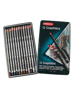 Derwent Graphitint Pencils combine a subtle hint of color with the soft gray tones of graphite, providing a totally unique drawing effect. These pencils provide a smooth, rich color lay down, and they can be blended together to produce a nearly endless array of deep, expressive hues.Graphitint pencils are water-soluble. When dry, they offer the merest suggestion of color. When water is added, their color becomes more vibrant. Their color can also be lightened or lifted with a soft eraser or wet brush.The set of 12 pencils contains: port, dark indigo, aubergine, slate green, chestnut, ivy, cool brown, cocoa, storm, midnight black, cloud grey, and cool grey.The set of 24 pencils includes: port, juniper, aubergine, dark indigo, shadow, steel blue, ocean blue, slate green, green grey, meadow, ivy, sage, chestnut, russet, cool brown, cocoa, autumn brown, storm, warm grey, midnight black, mountain grey, cloud grey, cool grey and white.