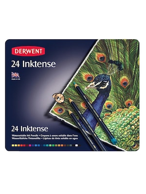 Derwent Inktense Pencils combine the brilliant intensity of pen and ink with the versatility of line and wash. This exciting range of water-soluble ink pencils is perfect for illustrators, designers and students as well as for pen and wash style drawings and floral artwork. The pencils provide a pure, vibrant color that washes out to leave a translucent ink-like effect. Once dry, the color wash is permanent and can be washed over with other media, wet or dry. Inktense Pencils are available in four sets:Set of 12 contains the following colors: apple green, baked earth, bark, deep indigo, fuchsia, ink black, leaf green, poppy red, sea blue, sun yellow, tangerine, and teal green.Set of 24 contains the following colors: antique white, apple green, baked earth, bark, bright blue, charcoal gray, chili red, deep indigo, field green, fuchsia, ink black, iris blue, leaf green, mustard, poppy red, sea blue, sherbet lemon, shiraz, sun yellow, tangerine, teal green, violet, and willow.