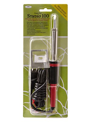 The Studio 100 Soldering Iron is an economical choice for production, studio, and classroom use. This 100 watt iron has built-in temperature control, so there-s no need for a temperature control device.This high quality tool also features:1/4 in. (750degree F) iron chisel tip, perfect for stained glass projects-Stay cool- insulated comfort grip handleLightweight designQuick change nut for easy tip changesReplacement tips are sold separately.