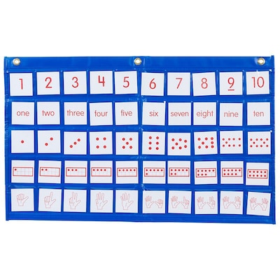 A number path is an effective counting model for young children. Each number is clearly defined by a rectangle and each rectangle can be counted. A number line can be confusing: students may start counting at zero and then be off by one, or they count the spaces between the numbers and end up between two numbers. The number path provides a very clear model to build understanding and fluency.The chart allows you to create number paths with cards showing multiple representations of the numbers 1-10: numbers, words, dots, ten-frames, and hands. Ideal for developing number sense, subitizing, and making tens. Set includes 50 cards and one 18" x 30" pocket chart.