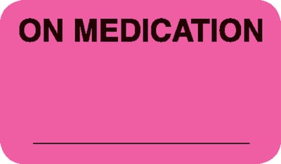Fluorescent Pink "On Medication" label alerts staff of care requirements without using much space