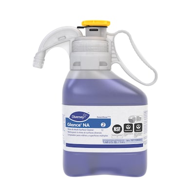 The Diversey Glance NA is a non-streaking, quick-drying, non-ammoniated glass cleaner. Use the cleaner SC on most washable surfaces, including chrome, stainless steel, bathroom fixtures, and laminate countertops. Blue in color with no fragrance added.