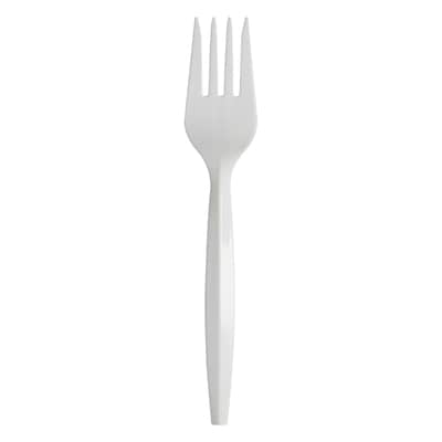 Each Dixie middle-weight fork is made of tough shatterproof polypropylene plastic that doesn't break under the strain of eating hard foods, such as meat, potatoes or fruits. Use these forks for gatherings or corporate events with customers or clients. These utensils are also safe for children to use, making them convenient for school cafeterias.