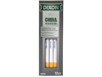 Get bright, sharp marks against dark colored paper by using these china markers. With a paper-wrapped barrel and tear-string feature, these markers don't require the use of a sharpener. These Dixon Phano China markers are PMA certified nontoxic and made to write on almost any nonporous or porous surface such as plastic, film and various other materials.