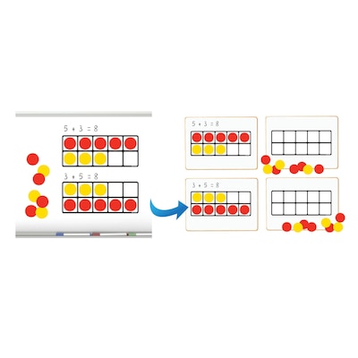 No flimsy frames--each die cut as a solid rectangle! Set features two sizes of magnetic, dry-erasable frames! Large frames help teachers demonstrate base ten and operation concepts on the classroom whiteboard. Smaller frames are for student practice on lap boards. Includes 2 large demo frames, 4 student frames, and 60 magnetic two-color counters (double- sided red/yellow)! Student boards sold separately. Demo frames measure 15"W x 6.19"H. Ages 5+/Grades K+