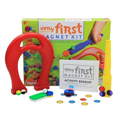 Inspires next generation scientists! Amazes early learners as they observe and investigate magnetism for the first time. Explore magnetic versus non-magnetic objects, play magnet games and discover if a magnetic force travels through water, cardboard or the sides of a glass jar. Very First Magnet Kit includes: 1 magnet wand, 1 giant horseshoe magnet, 10 magnet marbles, 20 counting chips, 3 ring magnets, 2 plastic-encased button magnets, 1 plastic-encased block magnet, and a complete activity booklet with translations in German, French and Spanish.