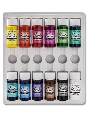 Bombay Pigmented India Inks are lightfast, waterproof, and non-clogging. The inks hold a line without spreading and flow smoothly without tip drying.India Ink sets contain 12 bottles (1/2 oz.) of ink.Set 1 colors are yellow, bright red, red, magenta, gr ass green, green, teal, blue, violet, brown, black, and white.Set 2 colors are golden yellow, orange, tangerine, crimson, cherry red, red violet, aqua, turquoise, yellow ochre, terra cotta, van dyke brown, and sepia.