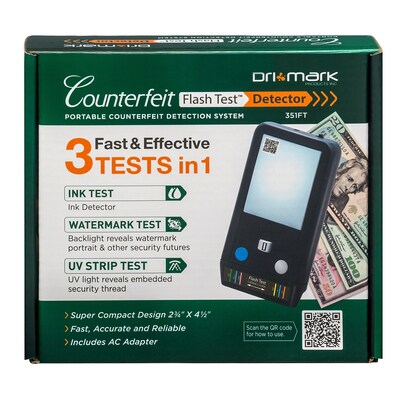 Dri Mark's revolutionary Flash Test is the smallest fastest counterfeit detector available. Designed specifically for your busy register, it is smaller than most smart-phones and attaches easily to the counter. Test for authentic US paper money in about 1 second, using the lightening-fast ink sensor. Also includes tests for UV features and watermark images. Includes instruction booklet, ac adaptor, and a QR code which links to an easy-to-follow instructional video.