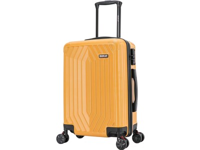 The hard-flex construction of this DUKAP STRATOS carry-on four-wheel spinner luggage offers maximum strength, durability, and a water-/scratch-resistant finish. It features a full interior fabric lining with a zipper compartment on one side and snap-on straps on the opposite side for easy packing.
