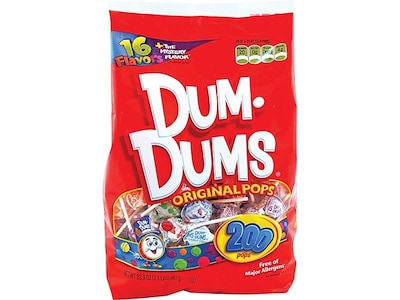 Place a bowl of Dum Dum lollipops at the reception desk or in the break room for a little treat during the workday. Because Dum-Dums don't contain common allergens such as peanuts, milk or gluten, they're safe for virtually everyone to enjoy. The 200-count bag of Dum Dums lollipops contains a variety of flavors to please all tastes.