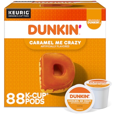Brimming with bakery-inspired flavors of creamy caramel, butterscotch, and sweet brown sugar, the Dunkin' Caramel Me Crazy coffee is so good, you won't believe your taste buds. Brew yourself a cup and enjoy the great taste of Dunkin' at home. This favorite is a delicious delight: packed with massive, mind-blowing flavor that makes it the perfect morning cup or a wonderful afternoon treat. It's a success story that started in 1950 as a single donut shop in Quincy, Massachusetts. Now, it's recognized as one of the most-loved brands in America. Dunkin' coffee keeps America running. Made using high-quality 100% arabica beans and a unique proprietary recipe that people love, it's a consistent, smooth, never-bitter, and rich-tasting cup of coffee. Brew, enjoy, repeat. Enjoy the great taste of Dunkin' coffee at home. The Dunkin' K-Cup pod is compatible with any Keurig K-Cup pod single-serve coffee maker: just pop one in and enjoy delicious freshly brewed coffee in no time at all. Filled with the freshest ground coffee, the pod brews a great-tasting cup, every time.
