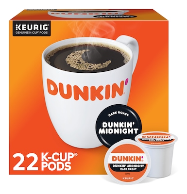 Brew an eye-opening cup with these dark-roast single-serving coffee pods. The smooth flavor from the dark-roast beans completes a satisfying sensory experience. This 22-count box of Keurig K-Cup Dunkin' K-Cups makes enough java to get the entire office moving on a big project. The great tasting flavors and roasts from Dunkin'® are now available in convenient Keurig® K-Cup® pods. The same delicious coffee served in Dunkin'® restaurants is now available for your office with the same consistent taste and recipe used for over 60 years.